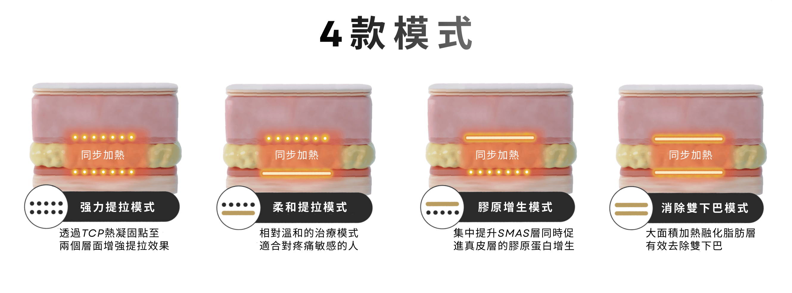 單一cartridge內整合4種模式,可依不同部位、鬆弛程度與目標(拉提/緊緻/再生)進行微調。