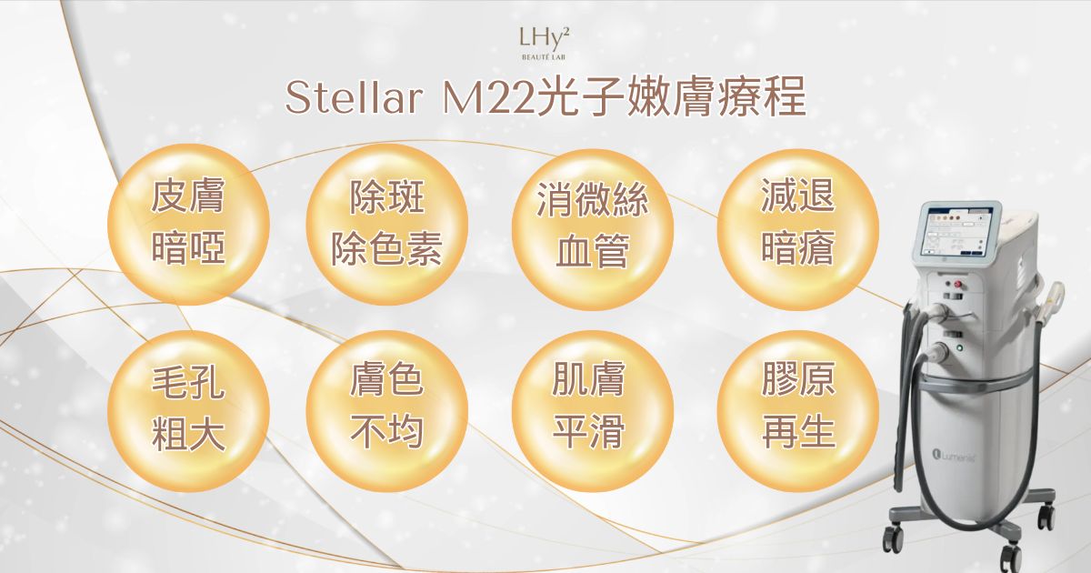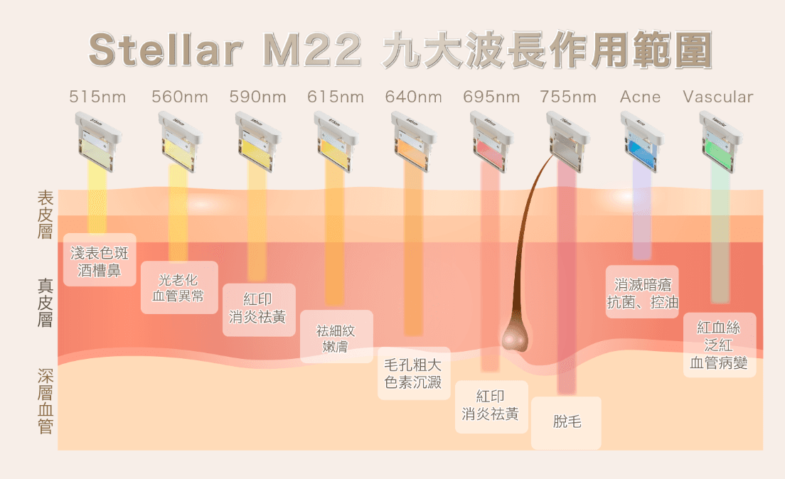 Stellar M22第8代AOPT超光子嫩膚屬於醫學級IPL(Intense Pulsed Light)療程,利用多波長光能量傳遞到皮膚問題的根源,針對「黑(色素)」「紅(血管/泛紅)」「暗沉粗糙(膚質)」等膚況進行綜合改善。
